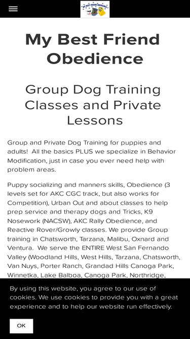 61%My Best Friend Obedience is proud to bring you the latest techniques in dog training and behavior modification in the San Fernando Valley, California. Of course, all of our training is positive motivation based....dog training needs to be fun and worthwhile for you and your dog. We don't just teach your dog, we teach you! People often throw good money after bad when it comes to training, someone else trains the dog and the owner has no idea how it was done or how the trainer was able to get through to the dog, where the owner could not! Consequently, after the dog is back with the owner a few months, things slip back to the way they were before training! All the fancy guarantees you get just mean that your dog must go back and be continually retrained....but if the dog works for the trainer then they tell you there's nothing more they can do for you!