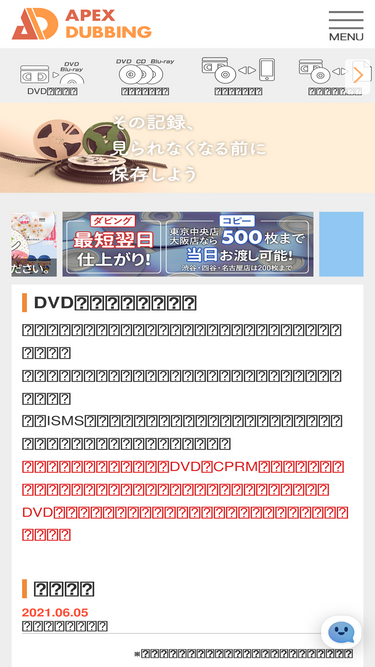 24%DVDダビング、DVDコピーサービスの専門店「エイペックスダビング」の公式ウェブサイト。各動画データの変換やMP4、DVD1枚からでもお気軽にご依頼ください。即日対応のダビングサービスもご用意があります。