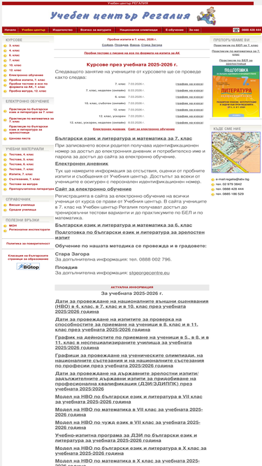 81%учебен център регалия предлага обучение за 6. клас и за кандидатстване след 7. клас. учебен център регалия организира пробни изпити за кандидатстващи след 7. клас на сайта е публикувана информация за ученици, кандидатстващи след 7. клас - минимални балове за класиране, план-прием и изпитни теми, както и информация за кандидат-студенти. връзка към сайта на издателство регалия-6, което е специализирано в издаването на учебници и учебно-помощна литература.