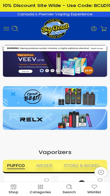 88%Big Cloud Vapor Bar offers a premium selection of vaporizers, e-cigs, and e-juices in Canada. Explore top brands like Puffco, Arizer, and Storz & Bickel. Shop disposable vapes, salt nics, and accessories for the ultimate vaping experience. Enjoy fast shipping and exclusive deals at Big Cloud Vapor Bar!