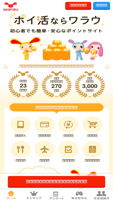 58%ワラウはポイ活の定番サイト。登録ユーザー数250万人。初心者でも貯めやすく、ポイ活を楽しむことができます。ワラウで毎日の暮らしをもっとおトクにしよう。