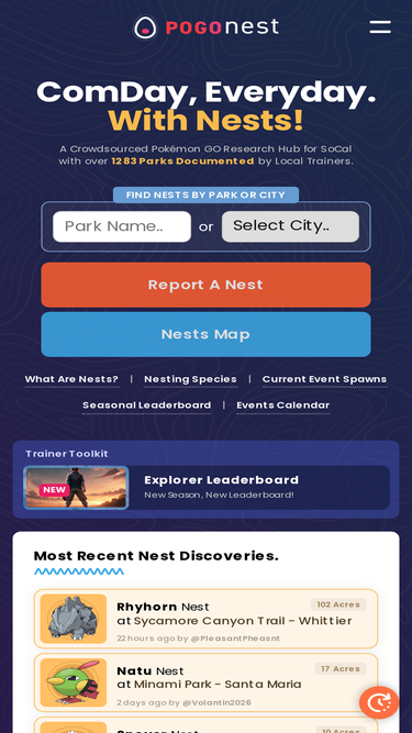 78%A Crowdsourced Pokémon GO Research Hub for Southern California with over 1200 Parks documented and thousands of Nests reported by local trainers! Discover and report Pokémon GO Nests and stay up to date on the latest in-game events.
