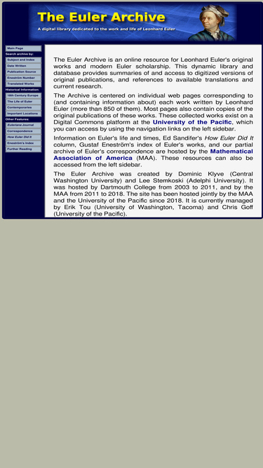 85%the euler archive is an online resource for leonhard euler's original works and modern euler scholarship. this dynamic library and database provides access to original publications, and references to available translations and current research.