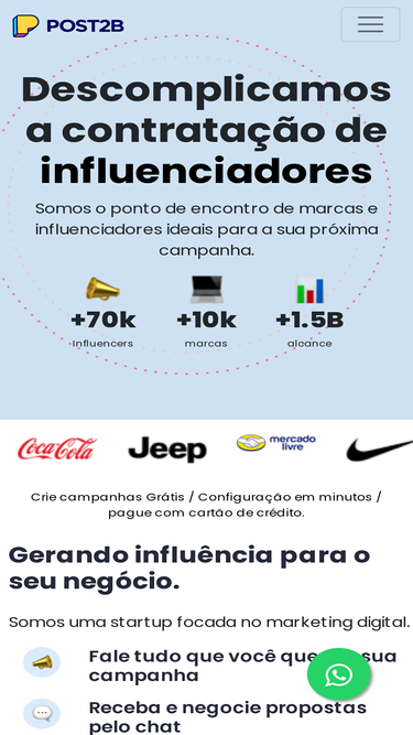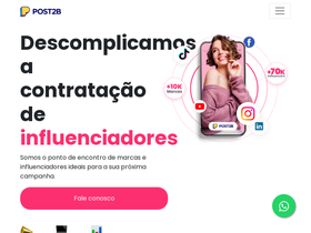 27%Temos o maior e mais completo portfólio de influenciadores do país. Somos a melhor plataforma para as suas campanhas. Conheça a Post2B
