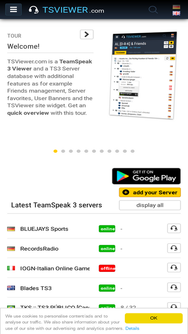 68%advanced teamspeak 3 viewer (tsviewer) with server stats & graphs, website plugins, server banners, user banners, user search and much more... over 12.000 registered teamspeak 3 servers.