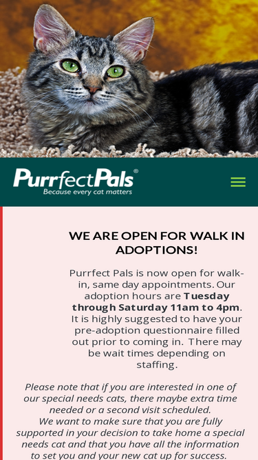 100%It is with great sadness that we announce the death of Kathy Centala, the founder of Purrfect Pals. Kathy passed on August 16th, 2024.