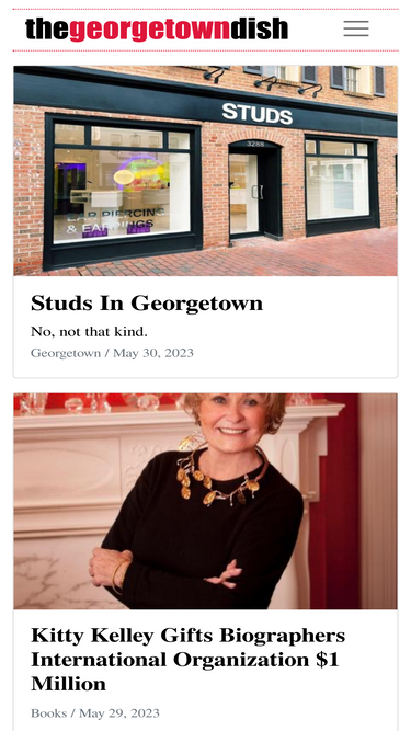 100%The Georgetown Dish is a daily news and entertainment site offering sparkling coverage of politics, business, real estate, the social scene, the arts, and dining ... with provocative opinions and engaging conversation by the people who make Georgetown that uniquely influential community in the nation's capital.