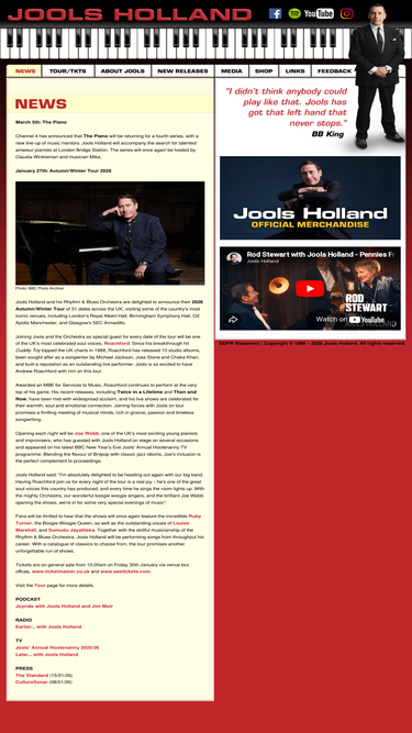 80%former squeeze musician jools holland is the most popular pianist and bandleader in the united kingdom, and the man chosen by the beatles to conduct the interviews for their award-winning anthology television series.