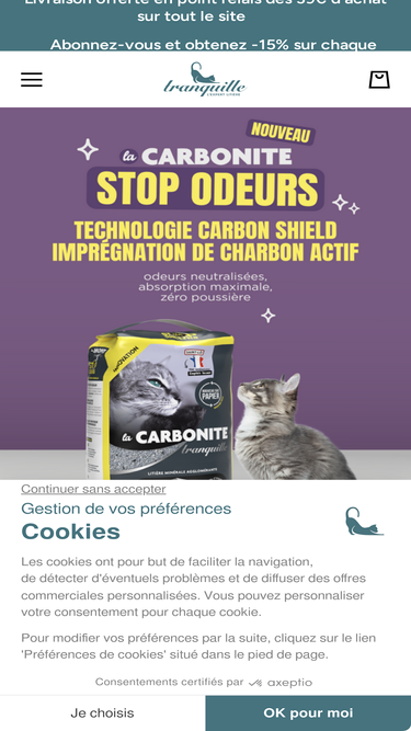 80%La stérilisation entraîne chez les chats une évolution physiologique et implique souvent un régime alimentaire adapté. Les chats stérilisés deviennent plus sédentaires et fréquentent davantage leur bac à litière. La formule de La Carbonite Tranquille Chats Stérilisés est ultra-absorbante et agglomérante. Elle contient également un grain fraîcheur qui dégage une fragrance assainissante au contact des matières souillées. 🚨 Le choix du point relais se fait après le paiement 🚨