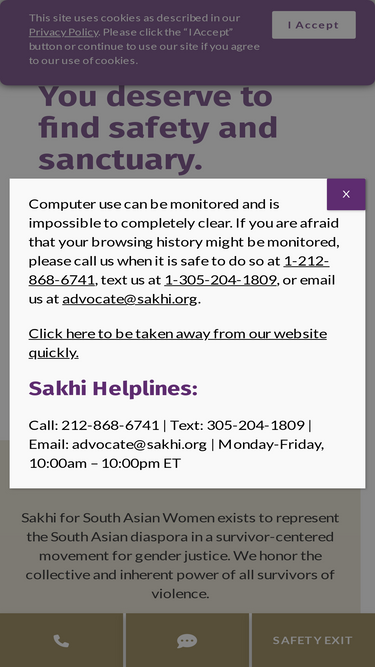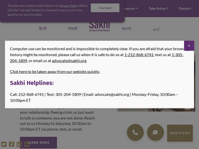 100%Call the Sakhi Helpline (212) 868-6741 Monday, Thursday, Friday, Saturday 10am-10pm. Tuesday, Wednesday 24 Hours. If this is an emergency, dial 911 if it is safe for you to do so. After hours, call the National Domestic Violence Hotline (800) 799-7233.