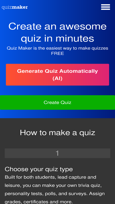 89%Make your own online quiz. Capture leads and create tests. Create compelling viral quizzes that capture leads or intelligently quiz your students. Very easy to use