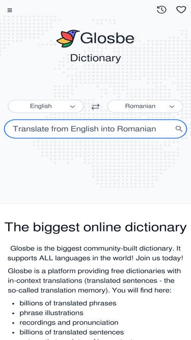 75%glosbe dictionary - one place, all languages! translations, example sentences, pronunciation recordings and grammar references. check it out!
