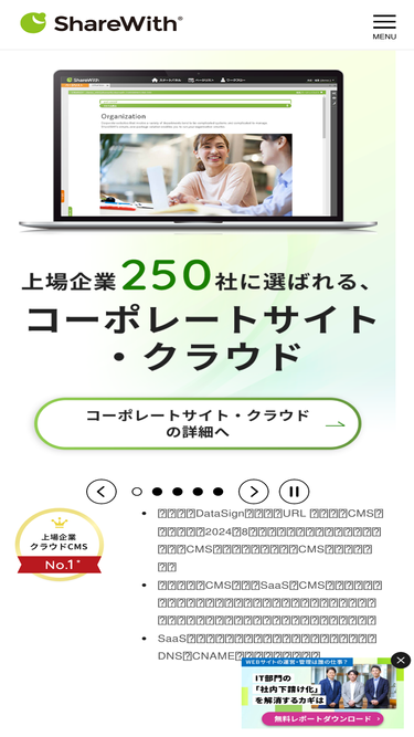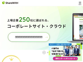 100%「ShareWithR」は、組織で運営するコーポレートサイトを持続的運営へ導く、上場企業シェアNo.1のクラウドCMSです。TDnet連携も可能な自動化と統合の仕組み・絶妙な管理画面・最高レベルのインフラをワンパッケージ。