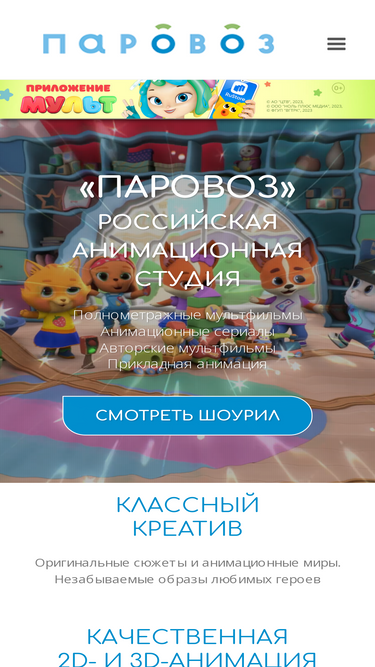 100%Анимационная студия «Паровоз» — крупнейший российский производитель современных мультфильмов и 3D/2D-мультсериалов для детей. Популярные проекты: «Ми-ми-мишки», «Сказочный патруль», «Лео и Тиг», «Герои Энвелла», «Be-Be-Bears», «Fantasy Patrol», «Woodventures», «Cutie Cubies», «F.A.S.T.», «Морики Дорики» и другие. На сайте — каталог мультсериалов, трейлеры, новости, арт, информация о создании анимации. Мультфильмы от студии «Паровоз» выходят на YouTube, ТВ и платформах в России и по всему миру.