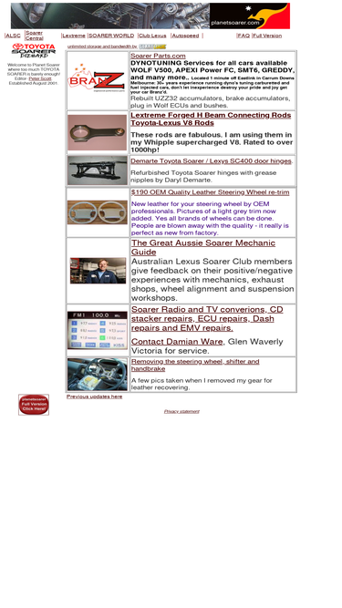78%planetsoarer is an automotive diy site that goes beyond the workshop manual, sensible scientific advice regarding car modification and service including cold air intakes, performance testing, oil analysis, exhausts, circuit racing, transmissions, wheels, tyres, electronics, dynometer / dyno results automotive videos and sounds. principles apply to all cars with a special emphasis on the lexus v8 sc400