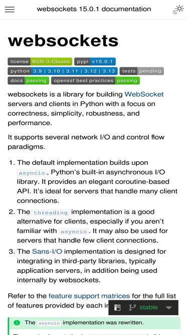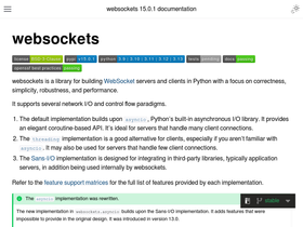 90%Enterprise: websockets is maintained with high standards, making it suitable for enterprise use cases. Additional guarantees are available via Tidelift. If you’re using it in a professional setting...