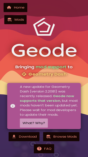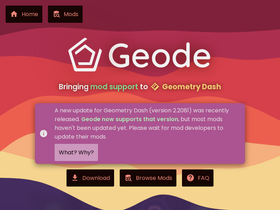 80%main page for geode, the most popular mod loader for geometry dash