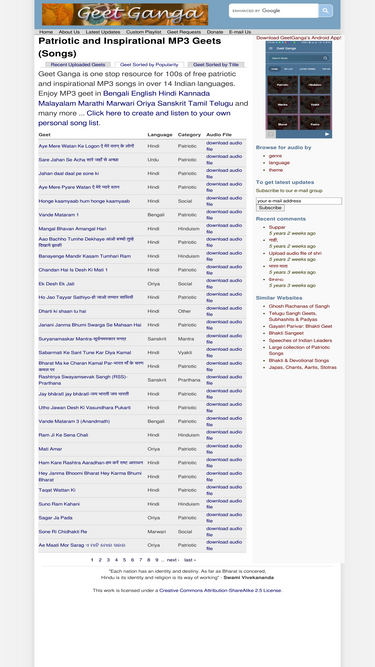 68%geet ganga is a one stop resources for 100s of free patriotic and inspirational songs in over 10 indian languages. listen to 100s of inspiring geets in hindi, telugu, kannada, marathi, gujarati, tamil, malayalam, bengali, sanskrit and english.