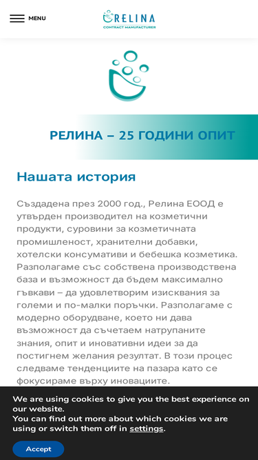 90%РЕЛИНА – 25 ГОДИНИ ОПИТ Нашата история Създадена през 2000 год., Релина ЕООД е утвърден производител на козметични продукти, суровини за козметичната промишленост, хранителни добавки, хотелски консумативи и бебешка козметика. Разполагаме със собствена производствена база и възможност да бъдем максимално гъвкави – да удовлетворим изисквания за големи и по-малки поръчки. Разполагаме с модерно оборудване, което […]
