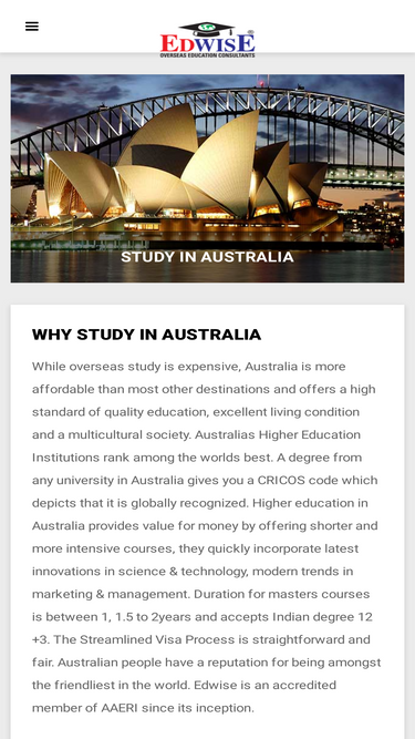 toll free 1800-102-0336. edwise is the one stop solution for all your international study needs. edwise provides information regarding higher education in australia, international studies in australia, universities in australia, mba in australia, courses in australia, admissions in australia universities and colleges and has a command over the education system in australia.
