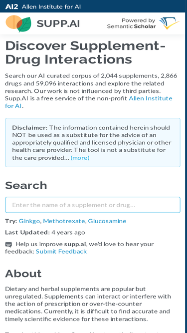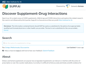 83%search our ai curated corpus of 2,044 supplements, 2,866 drugs and 59,096 interactions and explore the related research. our work is not influenced by third parties. supp.ai is a free service of the non-profit