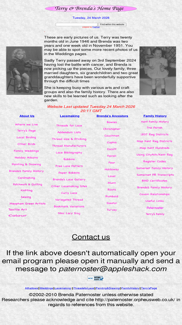90%home page of terry and brenda paternoster with lots of information about family history, especially in kent and somerset, and lace, lacemaking and lace threads and other craft interests.