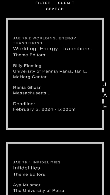 89%JAE’s latest issue 77.2 “Deserts” is here! Theme editors are Ersela Kripa, Francesco Marullo, and Stephen Mueller. Read the latest issue today!