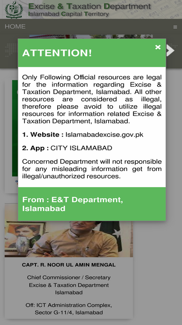 76%excise and taxation department, also known as islamabad excise, is a part of islamabad capital territory administration with the deputy commissioner who is also designated under as director general excise and taxation. the powers of secretary excise are exercised by the chief commissioner.