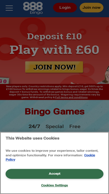 57%Enjoy a variety of fun online bingo games at the 888 bingo site. Join today and deposit for a special welcome bonus (T&C apply)