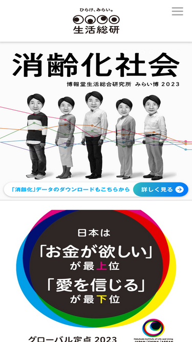 博報堂生活総合研究所は、博報堂が「生活者発想」を具現化するため、1981年に設立した研究所です。「ひらけ、みらい。」を合言葉に、多角的かつユニークな視点で世の中の動向を研究・提言し、未来を誘発する、世界にも例のないシンクタンクです。研究員一人ひとりの多彩な個性と、市場・業種の枠を超えた幅広い思考から、いまの延長線上にある「未来」を、生活者みんながもっとワクワクできる「みらい」にひらいていきます。