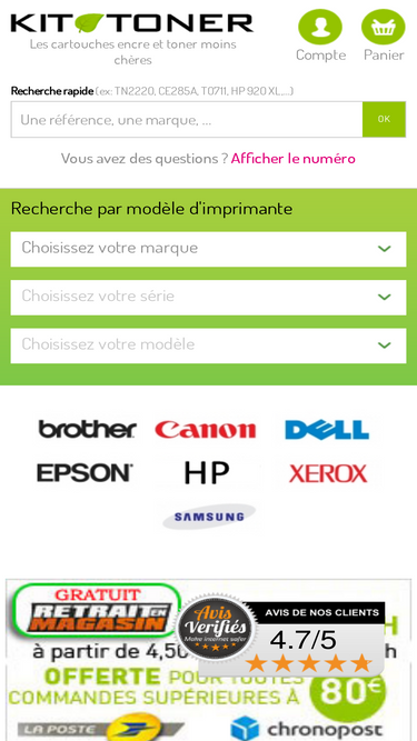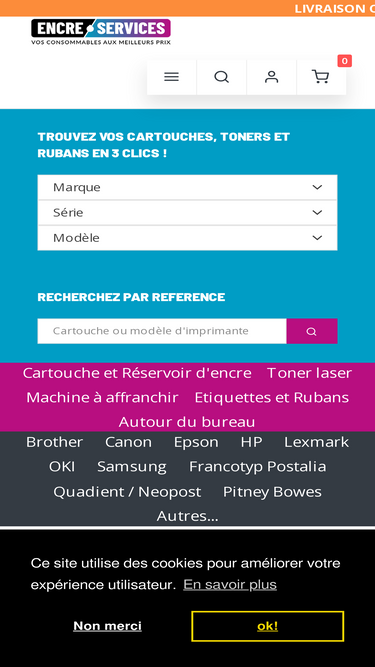 79%cartouche d'encre et toner. -80% pour toute marque d'imprimante. plus de 45000 clients satisfaits! epson, canon, samsung, lexmark, hp, brother en livraison 24/48h. consommables garantis et pas cher