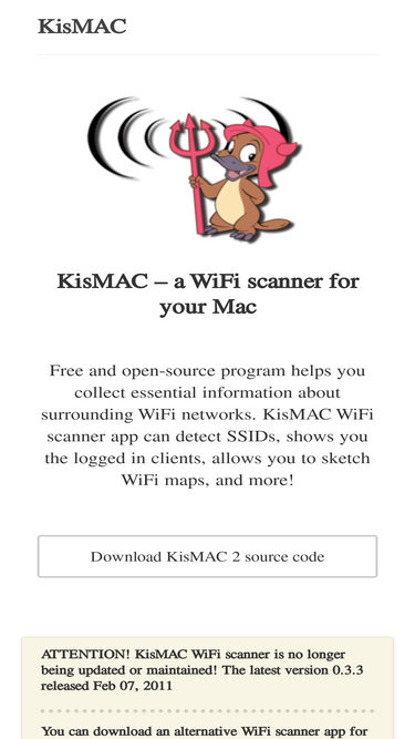 99%KisMAC is an open-source and free WiFi scanner and security program for Mac that helps you detect hidden SSIDs, see who is logged in on the network, create WiFi maps, etc.