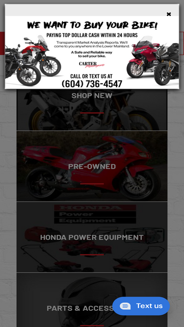 90%carter motorsports is a honda dealer in vancouver, bc, featuring atvs, motorcycles, side by sides, power equipment, and outboards from honda. we offer parts, rentals, service and financing and we are conveniently located near richmond, burnaby, north vancouver and new westminster.