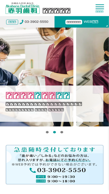78%赤羽駅南口徒歩6分、志茂駅1番出口徒歩7分。赤羽に本部を構える医療法人社団 歯友会・赤羽歯科「赤羽診療所」のオフィシャルサイトです。当院は、土日祝日を含め毎日診療を行っています。また、インプラント診療室や歯科技工所を併設しているので、歯のお悩みやトラブル解消から難症例まで総合的な治療を提供いたします。