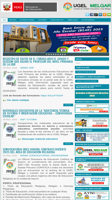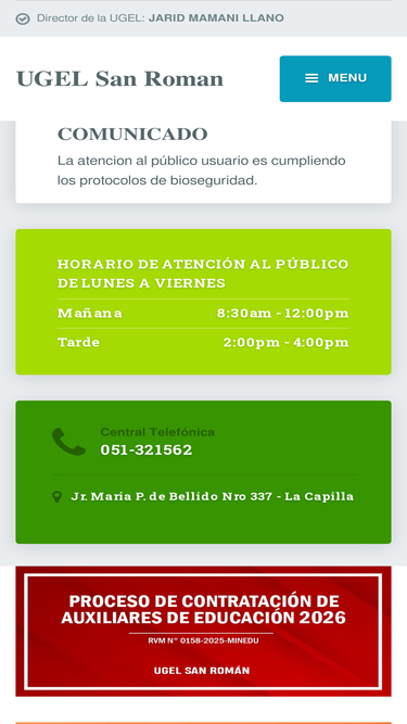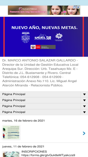 82%Dr. MARCO ANTONIO SALAZAR GALLARDO - Director de la Unidad de Gestión Educativa Local Arequipa Sur. Dirección: Urb. Tasahuayo Mz. E - Distrito de J.L. Bustamante y Rivero. Central Telefónica: 054-612908 - 054-612909 - Administración Anexo No.110. Lic. Miguel Angel Alarcón Miranda - Relacionista Público.
