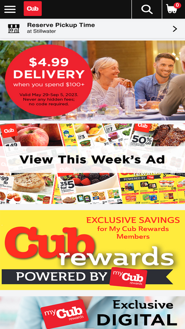 69%shop online or plan your instore visit with cub's exclusive online grocery shopping experience. see what's on sale every week in our digital weekly ad. get free pickup, same day delivery and exclusive my cub rewards savings every week. earn fuel discounts on every grocery purchase. cub is minnesota's hometown grocer, committed to offering the best produce, a full selection of meat and seafood, deli and bakery favorites, pet food, gift cards and flowers and a full-service pharmacy. cub has been delivering great value and supporting the community for over 55 years and we look forward to serving you.
