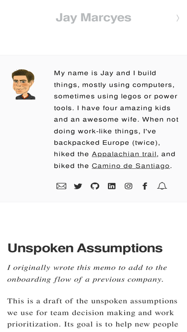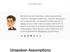 my name is jay and i build things, mostly using computers, sometimes using legos or power tools. i have four amazing kids and an awesome wife. i'm currently co-founder and ceo of bodega, but prior to that, i was co-founder and cto of first opinion (acquired by curai health) and plancast (acquired by active network). before figuring out what i wanted to do with my life i backpacked the appalachian trail and europe.