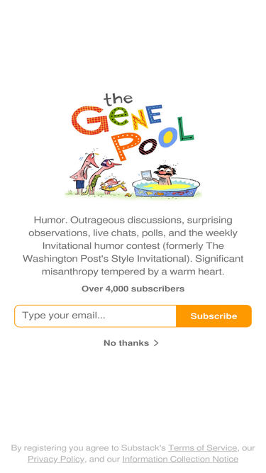 79%humor. outrageous discussions, surprising observations, live chats, polls, and the weekly invitational humor contest (formerly the washington post's style invitational). significant misanthropy tempered by a warm heart. click to read the gene pool, a substack publication with thousands of subscribers.