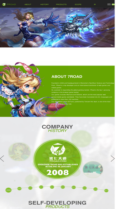 76%shenzhen 7th road technology co., ltd (7road)founded in 2008 and headquartered in shenzhen's nanshan science and technology park,7road is a top developer and an international distributor of web games and mobile games.