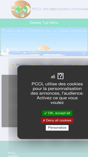 78%PCCL | INTERACTIVE PHYSICS SIMULATIONS | Physics and Chemistry by a Clear Learning : free interactive physics animations | online learning for sciences | Educational support in interactive flash animations in the physical sciences and chemistry in High School, Midle School, Upper School, Secondary School and Academy in the form of exercises corrected, MCQ, courses in chemistry, electricity, optics and mechanics for sciences classroom. FREE. Fun for teens. There are video tutorials for beginners in flash. The programme of physical sciences is treated with rigor but the proposed activities are fun so that students discover or trains having fun. Free & interactive teaching for courses. Corrected exercises.