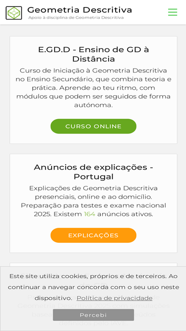 87%site de geometria descritiva, ensino secundário: resolução de exames nacionais, exercícios com propostas de resolução, testes online com classificação e correção, mais de 250 anúncios de explicações... entre outros conteúdos.