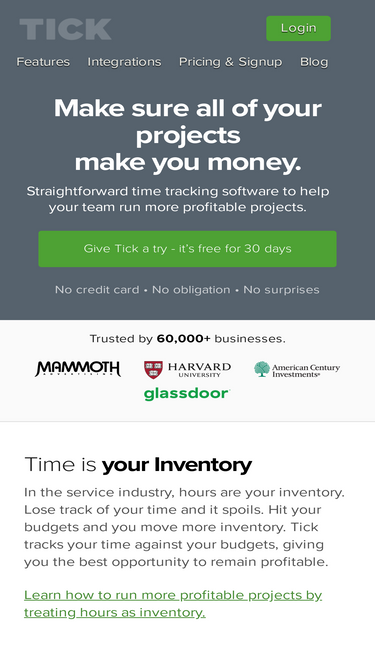 87%tick’s straightforward time tracking software and mobile apps help you track your time and hit your budgets. try it free for 30 days.