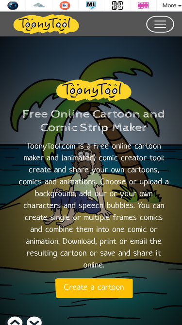 76%ToonyTool.com is a free online cartoon maker and (animated) comic creator tool: create and share your own cartoons, comics and animations. Choose or upload a background, add our or your own characters and speech bubbles. You can create single or multiple frames comics and combine them into one comic or animation. Download, print or email the resulting cartoon or save and share it online.