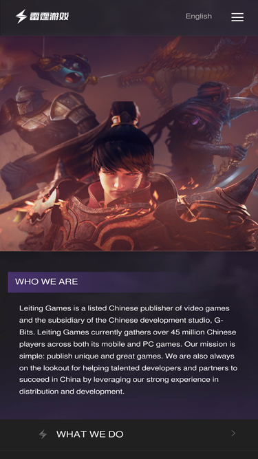 83%leiting games is a listed chinese publisher of video games and the subsidiary of the chinese development studio, g-bits. leiting's mission is simple: publish unique and great games. we are also always on the lookout for helping talented developers and partners to succeed in china by leveraging our strong experience in distribution and development.