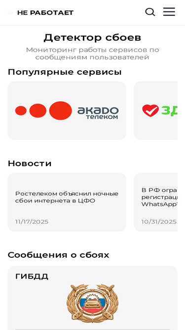 Остальные пять конкурентов в топе-10 следующие: downdetector.su (количество посещений — 39.7K, по данным на ноябрь 2025), qms.ru (количество посещений — 767.9K, по данным на ноябрь 2025), dominternet.ru (количество посещений — 1.6M, по данным на ноябрь 2025), news.ru (количество посещений — 10.4M, по данным на ноябрь 2025) и xn--80aacod7bknvc.xn--p1ai (количество посещений — 75K, по данным на ноябрь 2025).