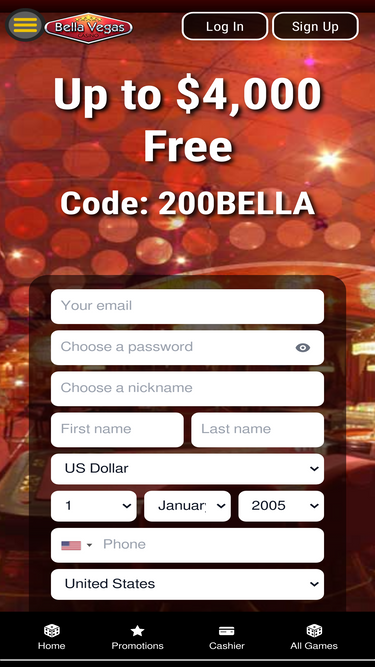 63%get a 200% match up to $4,000 if you sign up today. lady luck of vegas, smiles on your winnings at bella vegas.