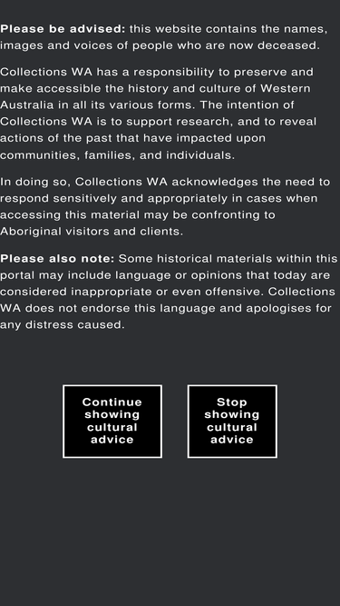 Collections WA is a free, searchable platform that brings together collections from libraries, galleries, museums, archives, historical societies, cultural organisations, community groups and other collecting organisations across Western Australia.