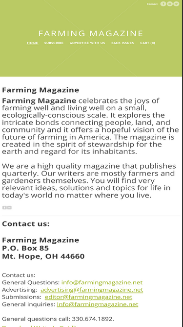 One-Year Subscription of electronic version of Farming Magazine $9.99 (Save $12 off the paper version) *You will receive your new subscription every 4 months. The new issues come out with the new seasons: Spring-out in April, Summer-out in June, Fall-out in September and Winter -out in December.