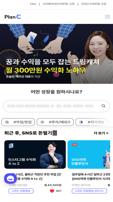 73%변화를 원하시나요? PLAN-C는 부업, 자기개발, 재테크, 손재주, 영어, 스피치, 운동/다이어트, 취미, 온라인 강의를 통해 돈과 능력을 얻는 새로운 길을 제시합니다. 여러분의 발전을 위한 강의 컨텐츠와 핸디북, 그리고 1:1코칭 서비스로 함께 풍족한 삶의 변화를 시작하세요.