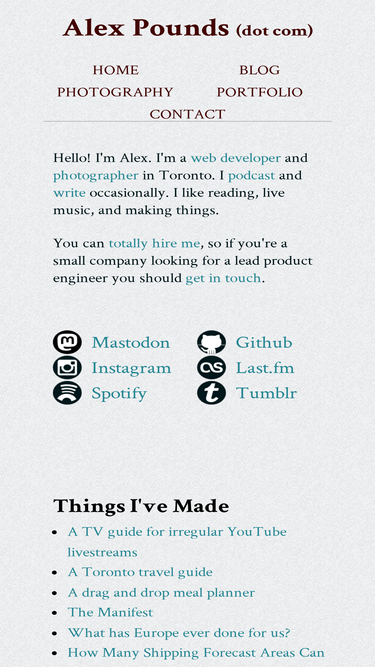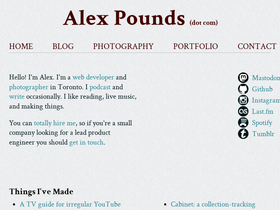 alexpeattie.com web sitesinin Ocak 2026 için en popüler 5 rakibi: borderleft.com, alexpounds.com, amolnw.wordpress.com, turnwall.com ve diğerleri.